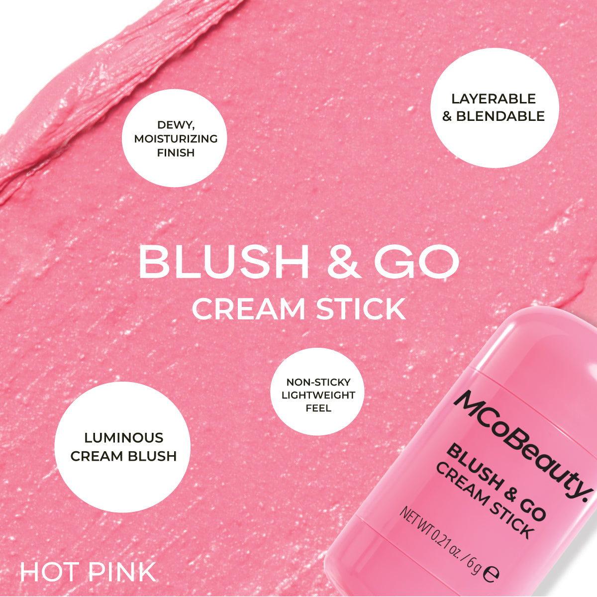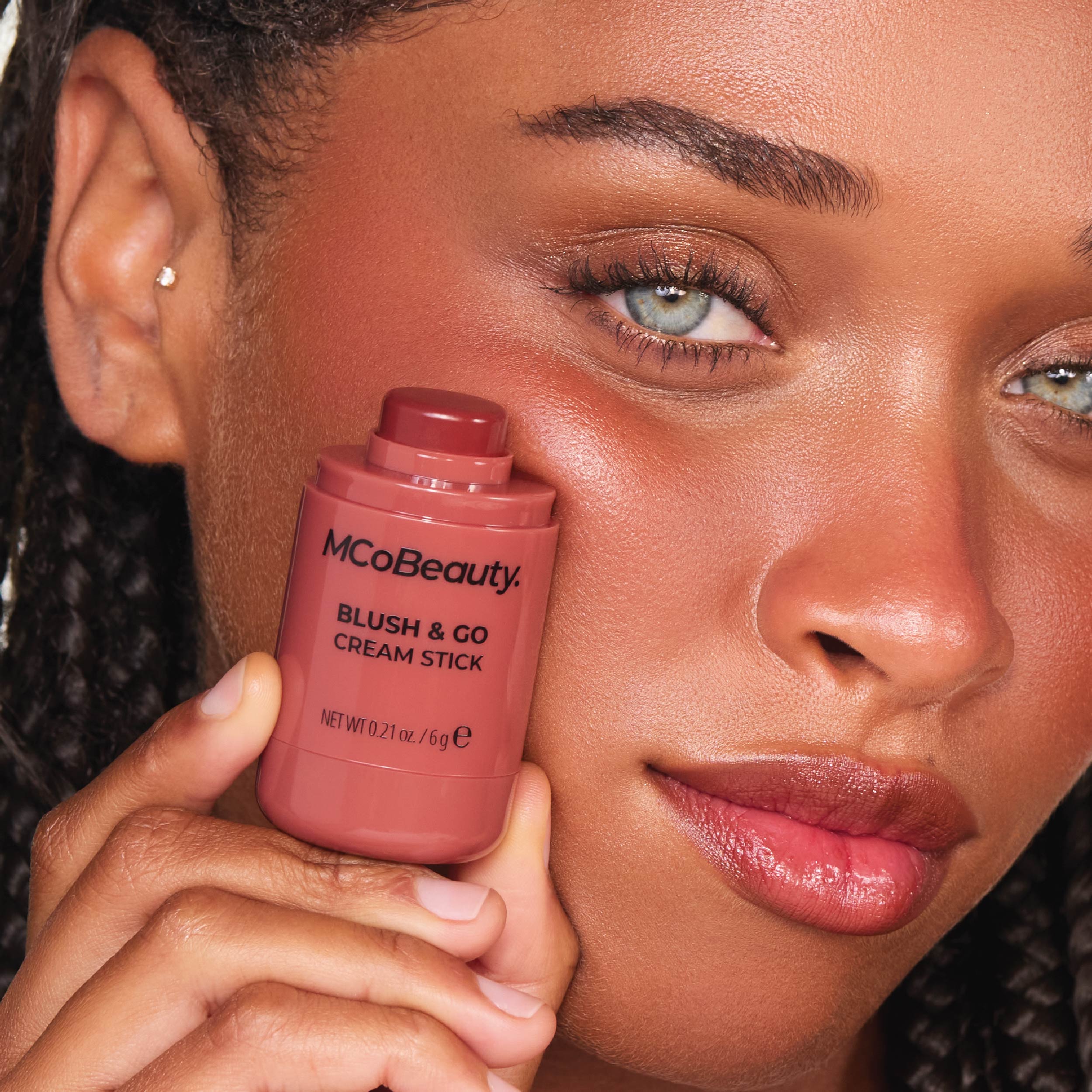MCoBeauty BLUSH & GO CREAM STICK imparts a glowing, radiant color with an easy-to-blend, dewy finish. Diffuse the color with a brush, sponge, or fingertips for a sheer finish, or layer it to achieve your desired level of color intensity.
