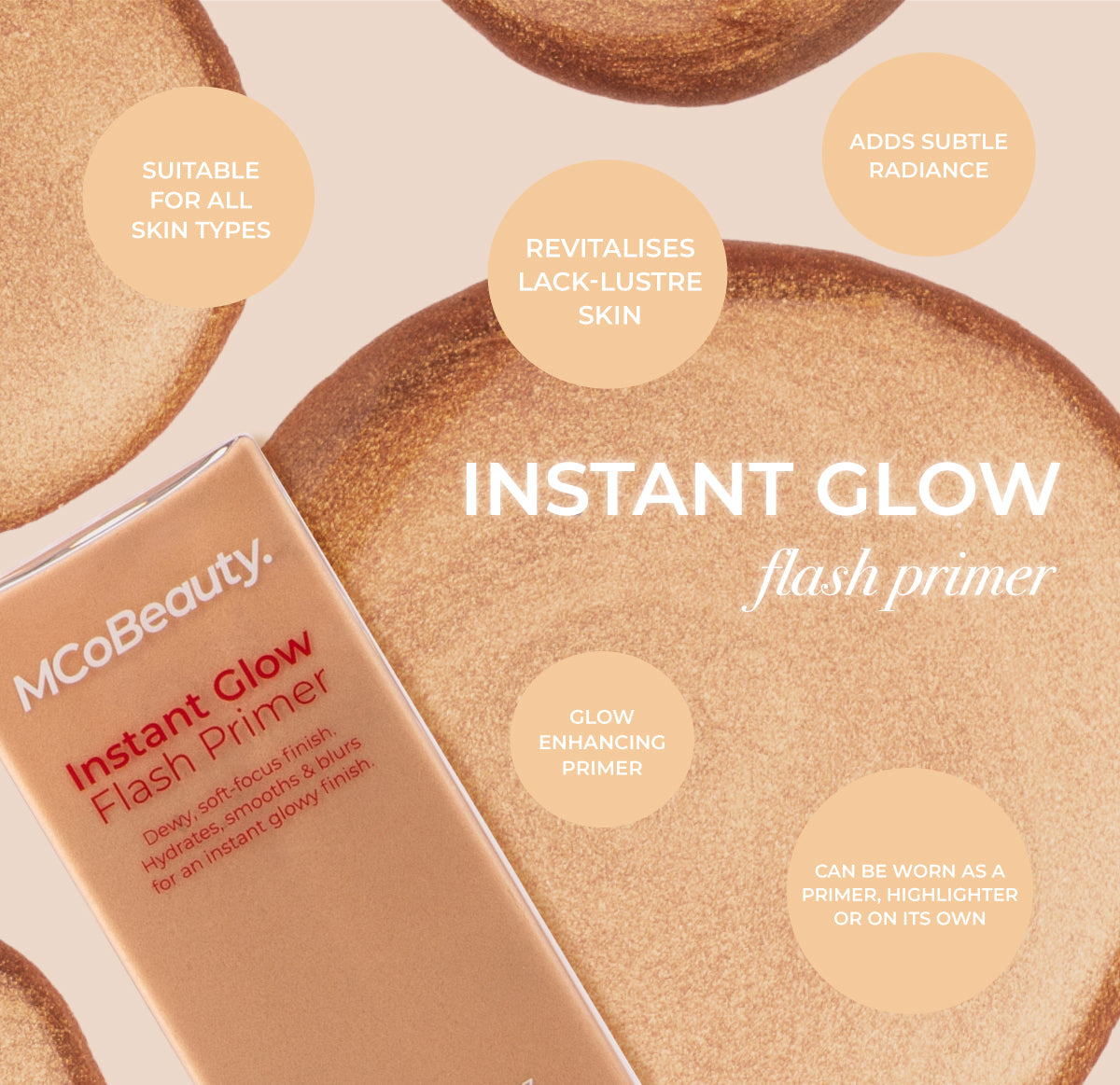 MCoBeauty INSTANT GLOW FLASH PRIMER adds instant radiance and hydration to skin, creating the ultimate fresh and dewy finish, with or without makeup. It can be worn on its own for instant radiance, under makeup as a glowy primer or over foundation as a subtle highlight. The lightweight formula is infused with a supercharged combination of skin-loving Hyaluronic Acid, Glycerin, Squalane and Vitamin E, offering the benefits of skincare and makeup in one tube.